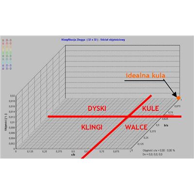 Dla przeprowadzania typowej analizy, wykonywanej z dokładnością ±1%, wystarczy posłużyć się dwumilionową matrycą kształtów ziaren. W każdym miejscu matrycy można zapisać dowolną liczbę ziaren, następnie na podstawie współrzędnych matrycy obliczyć ich objętość, kształt i udział objętościowy w całym zmierzonym rozkładzie ziaren. Dla oceny kształtu ziaren posłużono się klasyfikacją Zingga. Wyniki pomiarów przedstawiono na Fig. 4. Pod wykresem pokazane są wyniki tabelaryczne, gdzie podany jest procent objętości ziaren o różnych kształtach, sumaryczna objętość cząstek o kształcie kuli, walca, dysku i klingi (porównaj z Fig. 1). Dodatkowo wyliczona jest zawartość procentowa cząstek niekształtnych, tak samo jak przy pomocy suwmiarki Szulca.