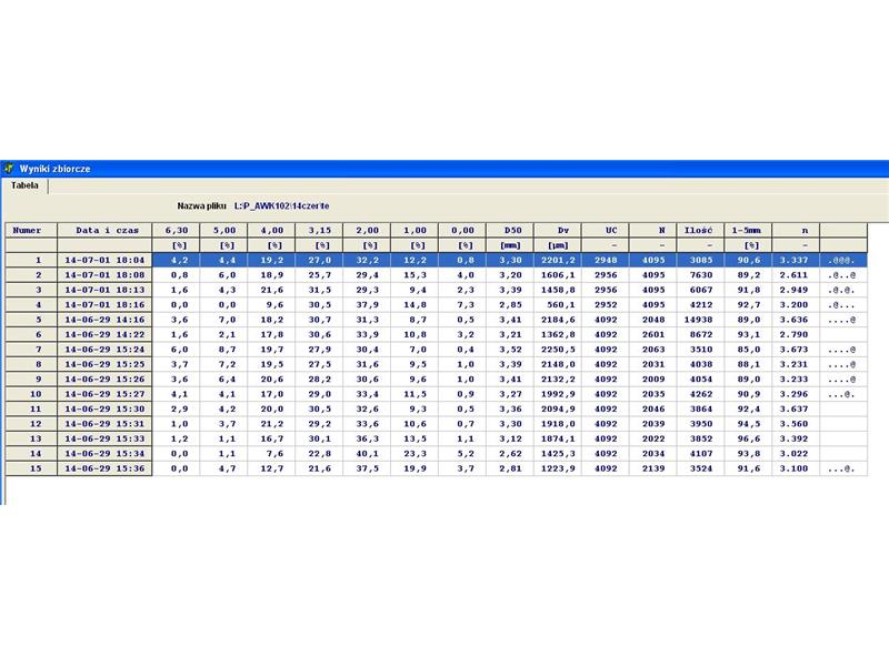 Urządzenie umożliwia nam wykonanie pełnej analizy sitowej, łącznie z policzeniem wartości wielkości ziarna D (średnia wielkość ziarna D50 i wartości D90 i D10) na uprzednio zdefiniowanych wirtualnych sitach, które "emulują" sita klasyczne o dowolnie wybranym rozmiarze oczka.