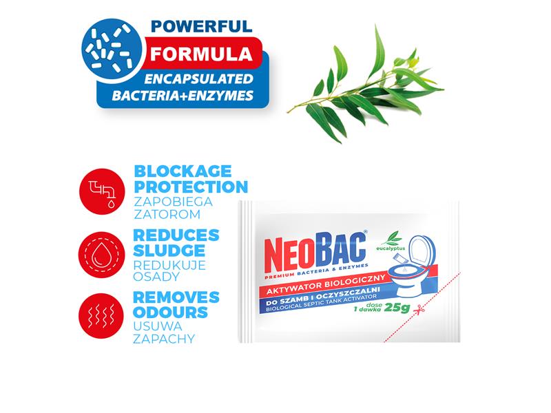 Preparat NeoBac jest środkiem biologicznym z kulturami bakterii saprofitycznych (naturalne bakterie ściekowe) oraz enzymami redukującymi substancje organiczne.