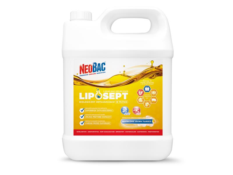 NeoBac LIPOSEPT 5L to innowacyjny biopreparat - odtłuszczacz w płynie oparty na wysokim stężeniu wyselekcjonowanych bakterii lipolitycznych oraz enzymów (lipaz), które skutecznie rozkładają tłuszcze, emulsje i złogi w kanalizacji, odpływach i separatorach tłuszczów.