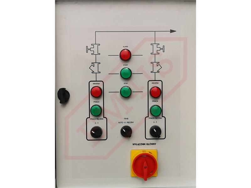 - W trybie automatycznym, pompy parcują naprzemiennie, a w sytuacjach zwiększonego napływu i załączenia pływaka alarmowego pracują równocześnie. W przypadku awarii jednej z pomp, druga automatycznie przejmuje jej pracę, a użytkownik zostaje powiadomiony o sytuacji awaryjnej kontrolką na panelu operatorskim oraz sygnalizacja optyczno-akustyczną na obudowie szafy sterującej.