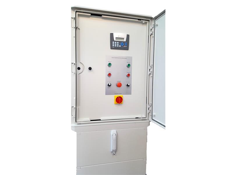Układ sterowania pomp jest realizowany poprzez mikroprocesorowy sterownik Jazz JZ20-R31 firmy Unitronics - zainstalowany w szafie ( na drzwiach wewnętrznych). Pompy sterowane są sondą hydrostatyczną + dodatkowe 2 sondy pływakowe dla poziomów skrajnych.